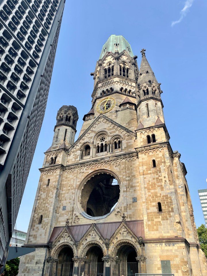 - Kaiser-Wilhelm-Gedächtniskirche (Kaiser Wilhelm Memorial Church): We saw this church while having a drink at the Spreegold rooftop and were immediately intrigued by its uniquely unfinished appearance. It was badly damaged during an air raid in World War II and instead of fully restoring the original church in the center of the Breitscheidplatz, the city chose to preserve the remnants of its spire and entrance hall as a memorial to and reminder of the devastation of the city during World War II.