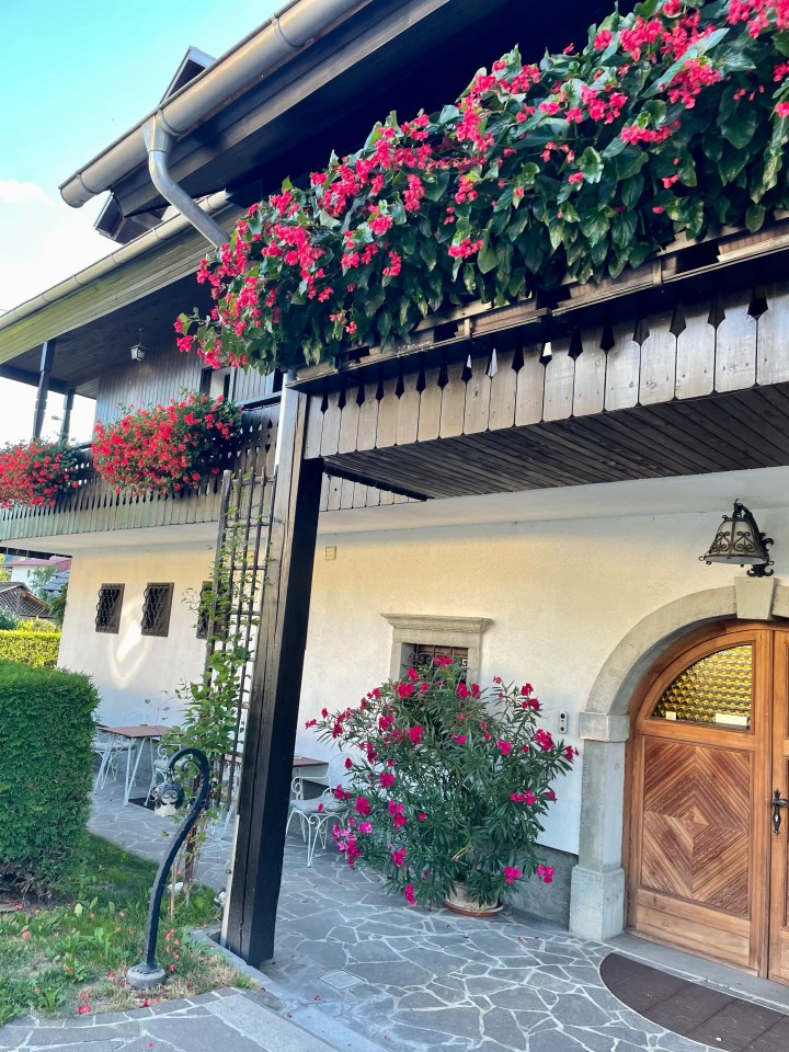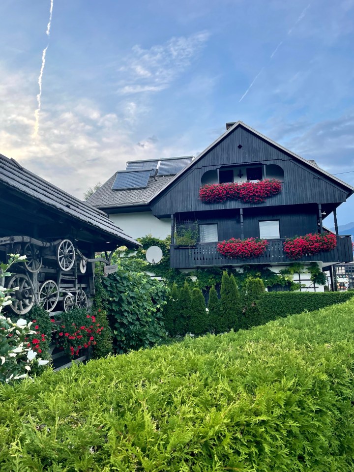Although Lake Bled is only about 30 miles outside of the Slovenian capital of Ljubljana, we flew into Zagreb, Croatia because we were able to get unusually cheap tickets with British Airways. It took us ~2 hours to drive from Zagreb to Bled, which was really quite easy and ended up being a very nice way to see more of the beautiful Slovenian countryside. Slovenia is known for being one of the greenest countries in Europe in terms of sustainability practices, but it’s also literally very green—we felt like we were in the middle of a forest as soon as we crossed the border. In addition to the natural beauty, Slovenian homeowners clearly take a lot of pride in their heritage, and the majority of the homes and farms we saw incorporated traditional architectural and decorative components, including flowerboxes with brightly colored flowers under each window, bee-friendly gardens (beekeeping is a very important part of Slovenian culture), and special freestanding structures for drying hay called kozolci.
