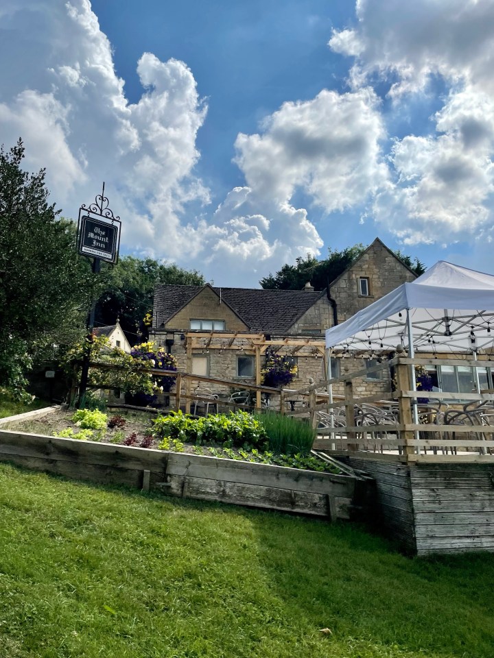 - The Mount Inn (Stanton): We had originally planned to just stop in for a pre-walk pint at this traditional pub in one of the prettiest and most idyllic villages in the Cotswolds, but the weather was so lovely and the outdoor garden seating was so inviting that we ended up forgoing the walk in lieu of having a few more beers. As the name suggests, the 17th-century village pub stands on the mount at the end of the village of Stanton, which is famous for its ancient houses built from the honey-colored limestone quarried in the area. Its hillside location provided gorgeous views across the quaint little village.