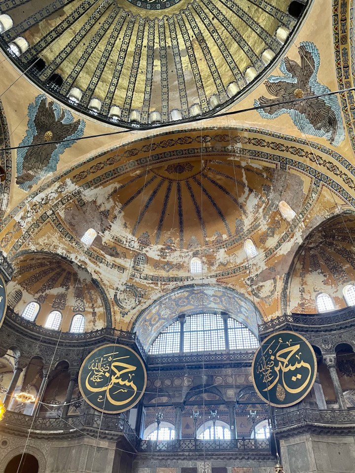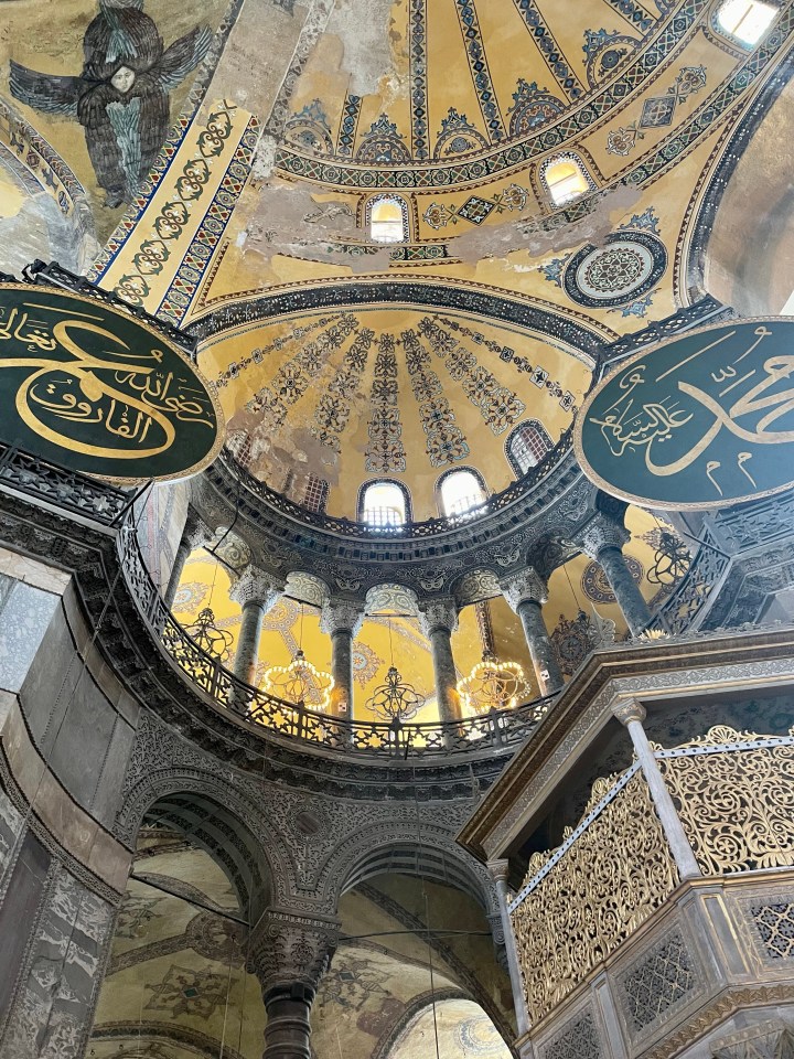 - Hagia Sofia Grand Mosque: The Ayasofya has been one of the city’s most iconic cultural and religious sites for more than 1,700 years. Built by Roman emperor Justinian I in the 6th century as the Church of the Holy Wisdom, it remained the world’s largest cathedral for nearly a thousand years and is considered to be the epitome of Byzantine architecture. The cathedral served as a Greek Orthodox church until the Ottoman conquest of Constantinople in 1453 and then as a mosque for nearly 500 years before reopening as a museum in 1935. In 2020, the site once again became a mosque, which was highly controversial for many reasons, including significant concern that this change in status would jeopardize the restoration and display of the original Christian mosaics and artwork that were plastered over during its original use as a mosque because Islam forbids figurative art that imitates God’s creation. The restored Christian-era iconography was still on display when we visited, but the most noticeable issue stemming from its reversal in status is that it is now a nightmare to visit as a tourist attraction and is more crowded than ever before. It was free to enter and tickets couldn’t be reserved in advance, so we had to wait with our tour group in the absolute longest line I have ever seen in my life and it was just as crowded when we got inside. It was still a worthwhile experience and the ancient building’s beauty was almost surreal, but we were more than ready to escape the tourist hordes once we saw the key highlights.