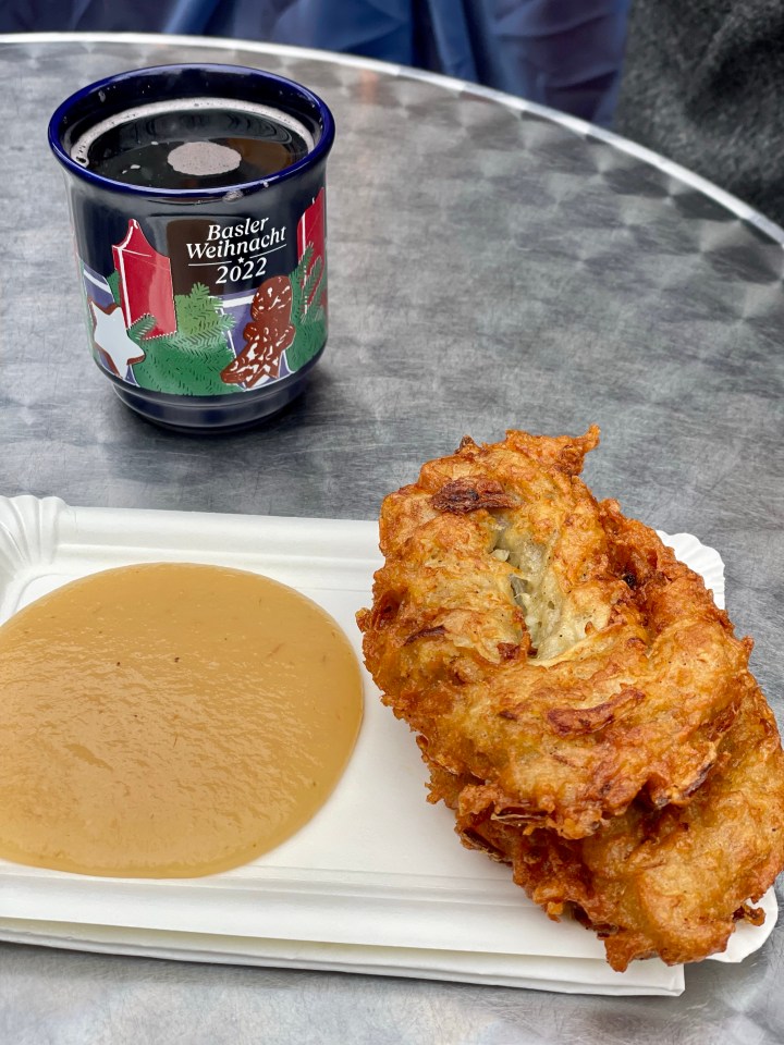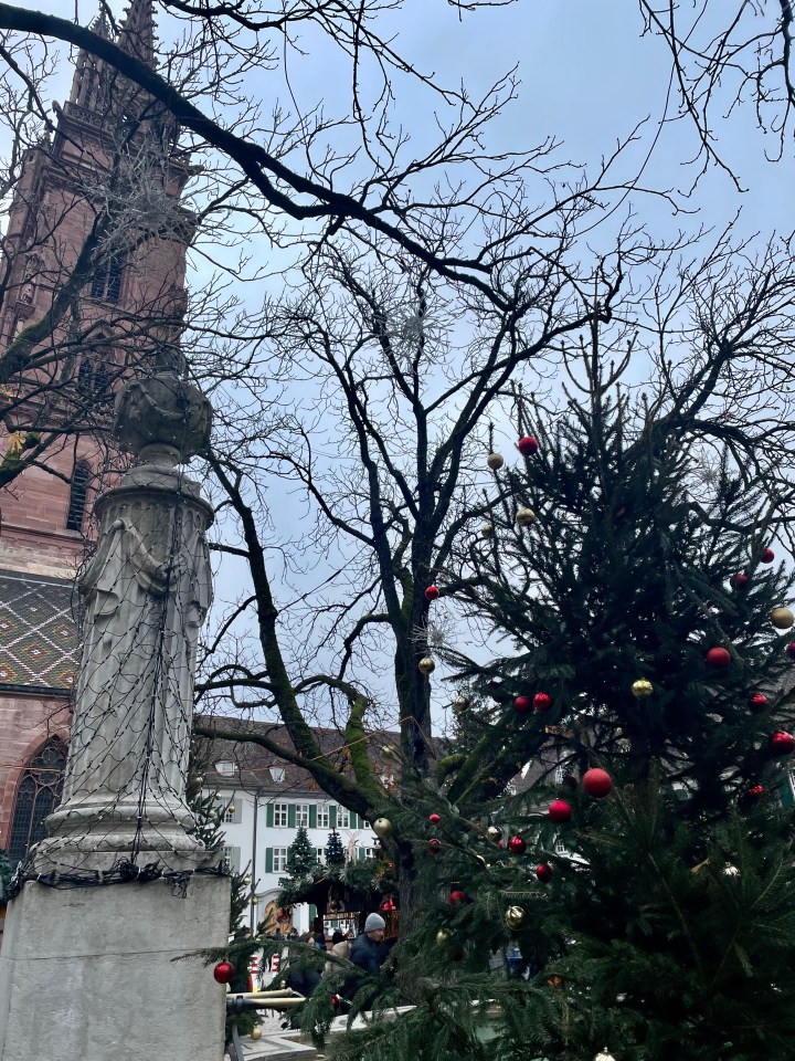 - Münsterplatz: The large square in front of the beautiful, twin-spired Basler Münster was the perfect setting for a magnificent, gigantic Christmas tree decorated by the local ‘King of Christmas’, Johann Wanner. We thoroughly enjoyed rösti (potato pancake) and some mulled wine, as well as the beautiful ceramic decorations we bought, but the real attraction of this part of the market was its ambiance and tasteful decoration. All of the rustic vendor stalls were ornately adorned with lots of fairy lights and tinsel, and many of them were topped with elaborate mechanical decorations.
