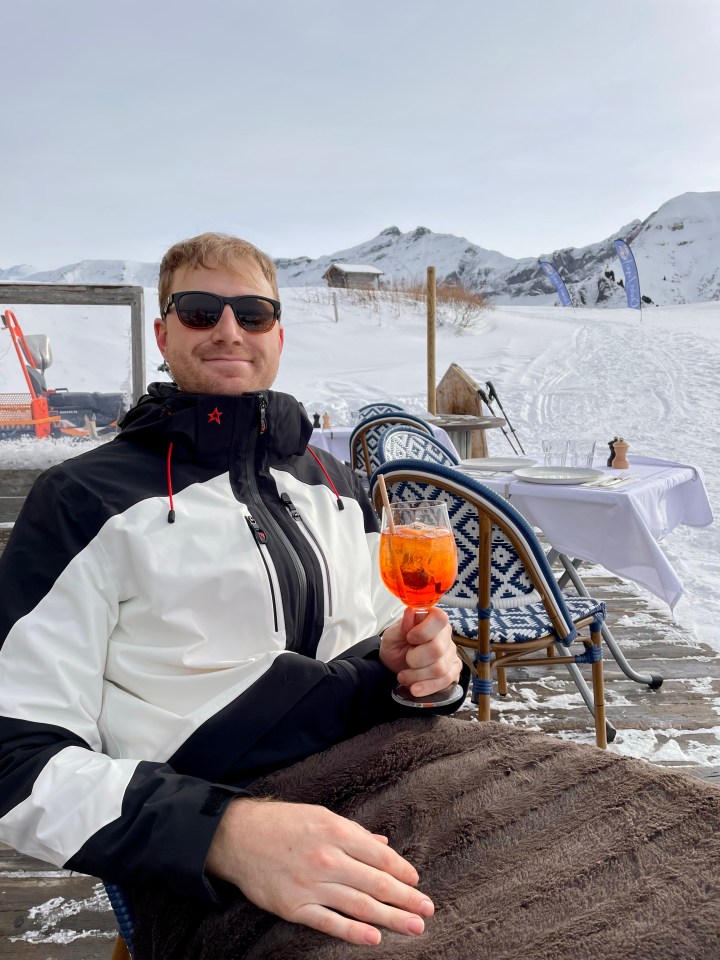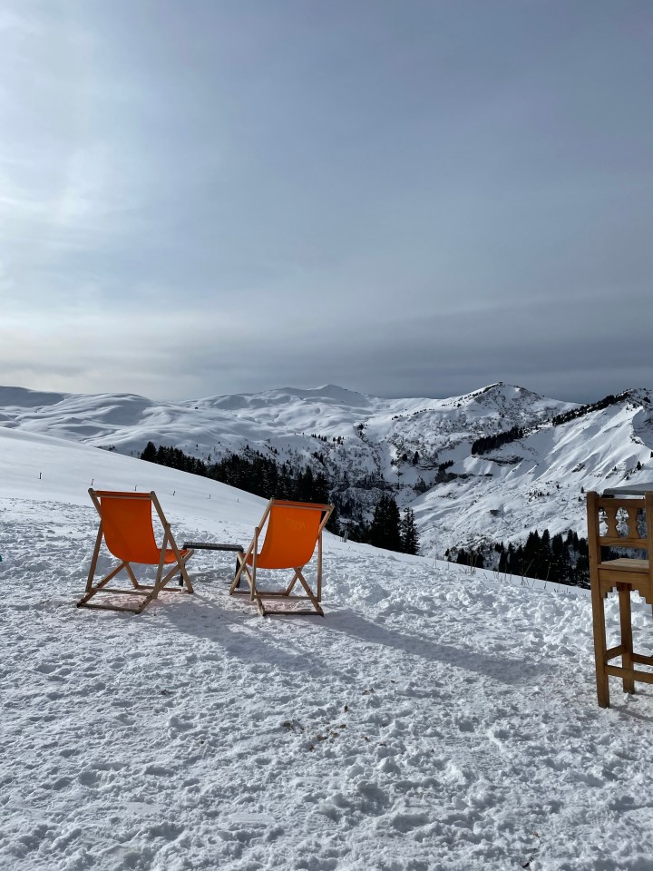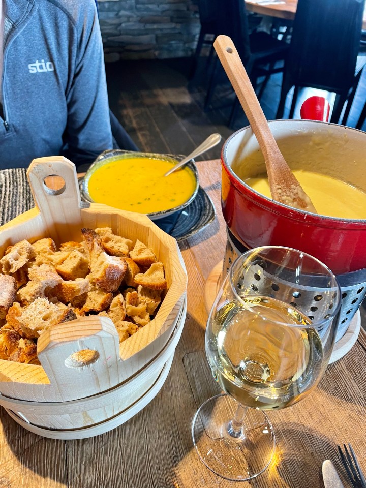 - L’Alpette Megève: This large, busy restaurant at the top of the Alpette chairlift had gorgeous, 360-degree views of the mountains and a sophisticated menu focused on local specialties. We had wonderful fondue and even better Champagne during lunch on our first day, and I ended up coming back later in the afternoon for a few more glasses of wine while I waited for Andy to finish up for the day.