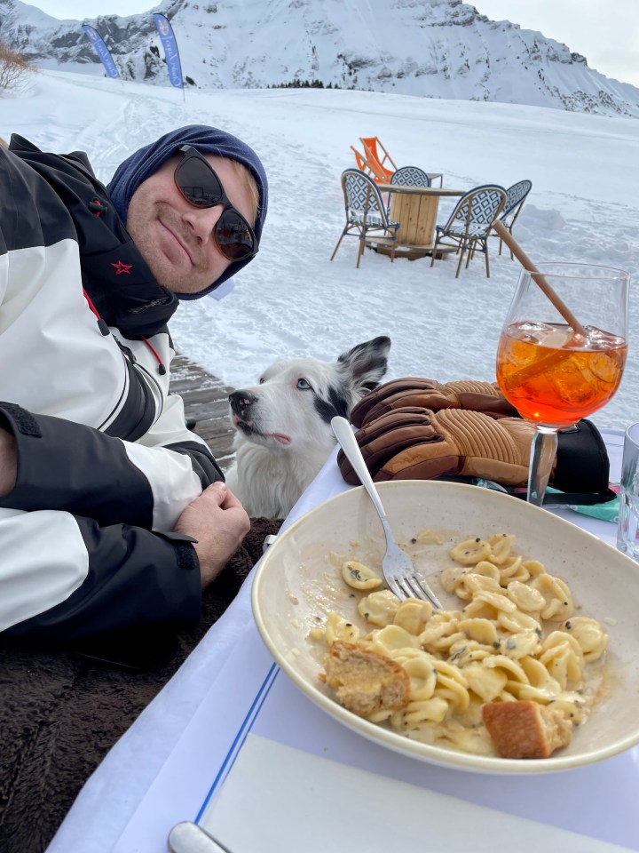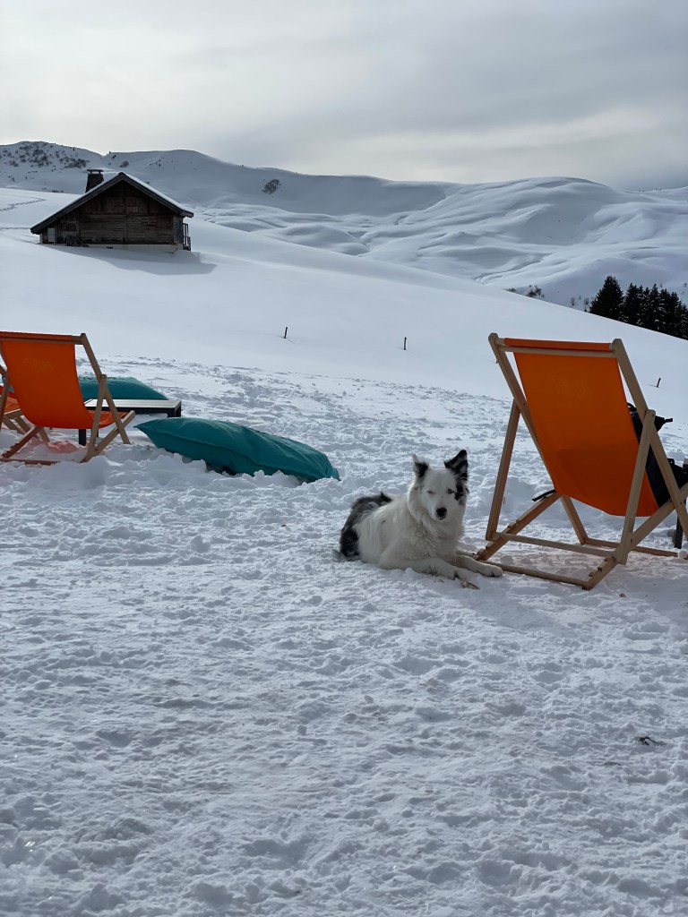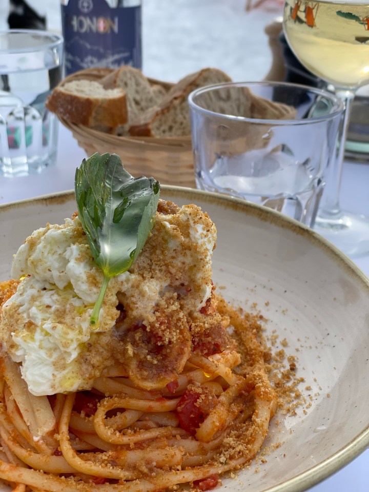- Chalet Lupo: The cozy Italian restaurant at the top of the Petite Fontaine chairlift is just about as good as gets for an on-mountain dining experience. It was a little tricky to make our way to the entrance, but once we arrived we were greeted by a very friendly sheepdog, Tony, and one of the most stunning views in the valley. It was so beautiful that we actually sat outside (with furry blankets provided by the restaurant) and we both had absolutely amazing pasta dishes that helped us reenergize before our final afternoon on the slopes.